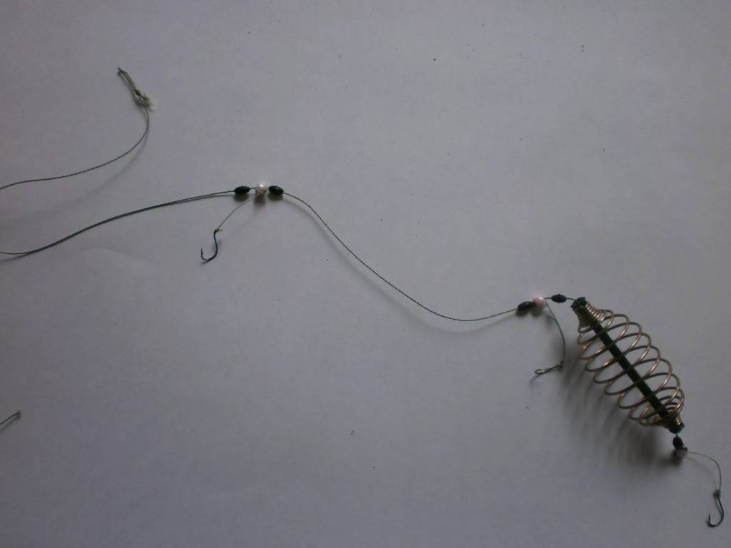 Стандартная донная оснастка, чтобы сделать донную удочку с поплавком – пружина продевается на леску, затем снизу — стопор или бусина. На конце лески привязываем вертлюжок либо заводное колечко. Стопор или бусина нужны, чтобы кормушка не била по узлу. Кольцо или вертлюжок привязываем любым рыболовным узлом – обычной рыбацкой петлей, клинчем, паломаром. А вот к колечку или вертлюгу можем ставить поводок. Или два поводка. Но для оснастки удочки с кормушкой двумя крючками нужно позаботиться, чтобы они не путались. То есть, поставить коромысло или связать подольскую вилку (об этом далее).