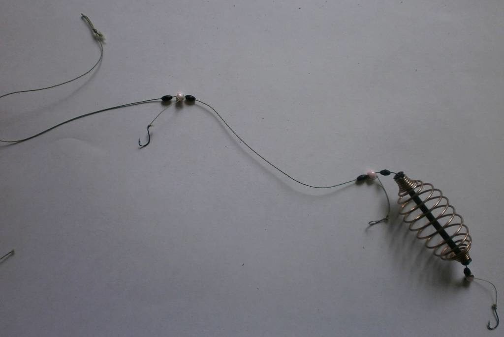 Затем на дно помещают более тонкую леску, оснащённую поводками и насадками. В качестве груза используется специальное кольцо, которое подтягивает всю оснастку ближе к кормушке, удерживая её на одном и том же месте.