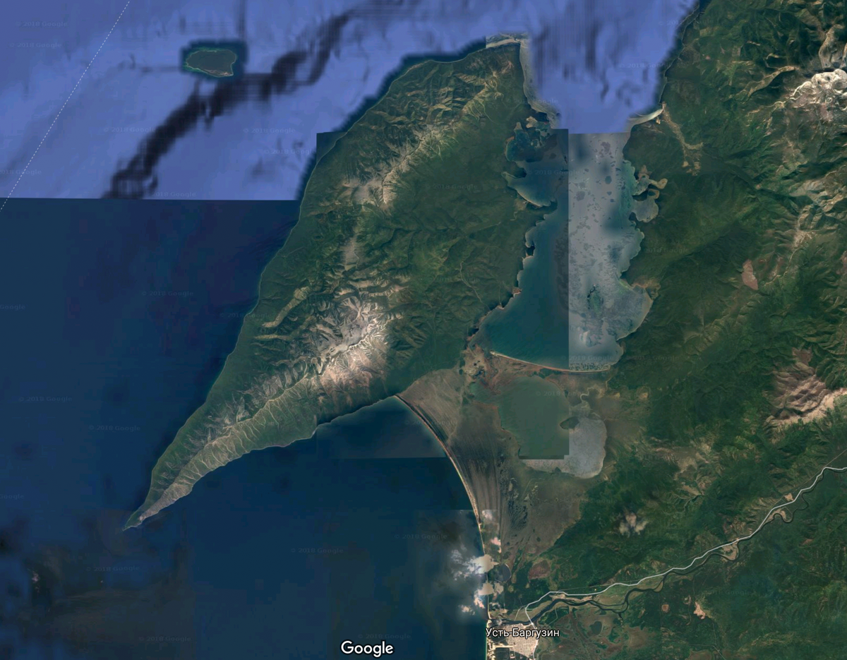 Коса после Усть-Баргузина — это берег Баргузинского залива. Гористая местность сверху — полуостров Святой Нос