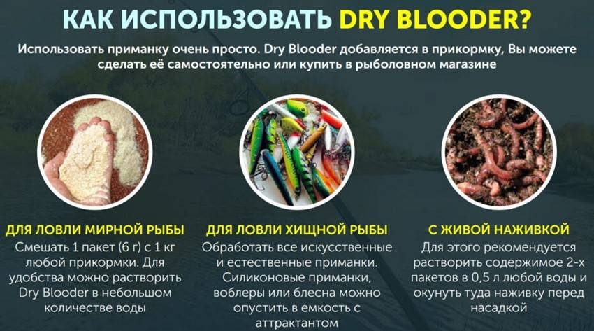Для рыбалки с живыми наживками. Для рыбной ловли на живую приманку возьмите 2 пакета Драй Блудер, высыпьте их содержимое в пол литра воды и тщательно размешайте до полного растворения. В полученный раствор с активатором, непосредственно перед погружением в воду – окуните выбранную вами наживку.