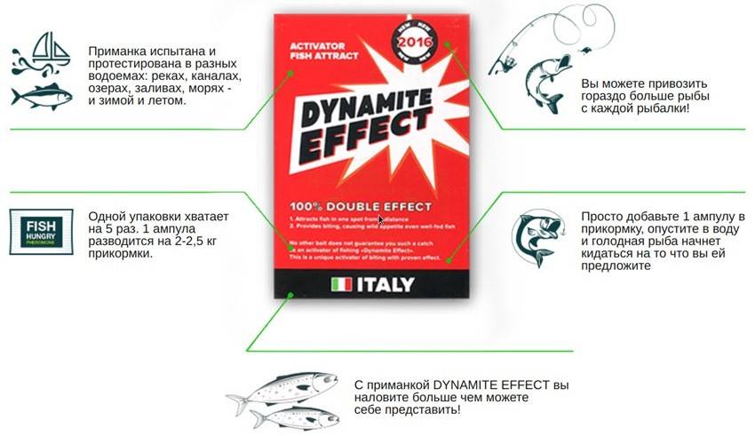 С DYNAMITE EFFECT у вас будет только 1 вопрос после рыбной ловли: «Куда сложить добычу, потому что багажника не хватает!». Итальянское средство доказало эффективность в море, реках, озерах, болотах и других водоемах. Оно может использоваться в любое время года: зимой, весной, летом или осенью.