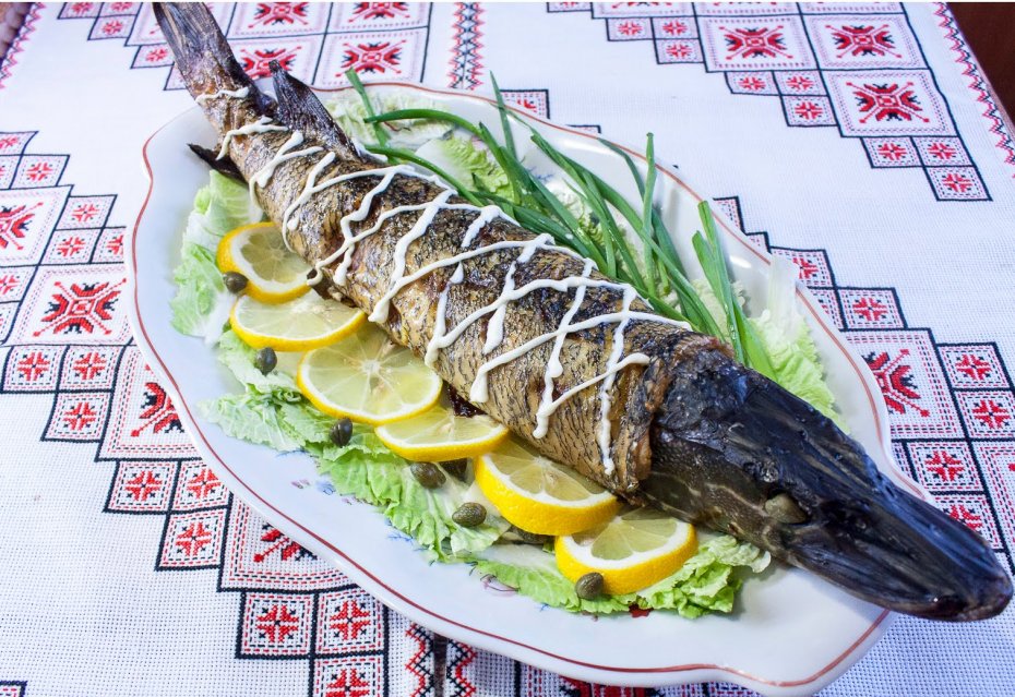 Фаршированную щуку от Лазерсона можно украсить овощами, оливками, кетчупом или различными соусами.