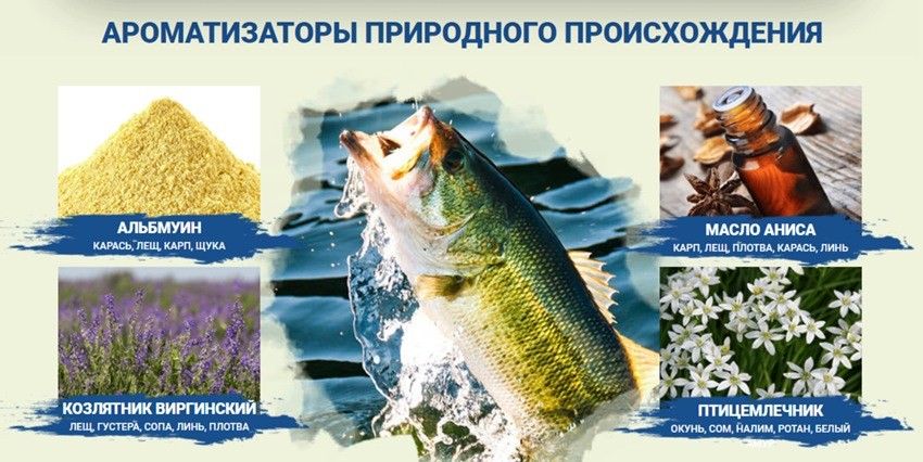 В составе добавки должны присутствовать ароматизаторы и аттрактанты, которые могут быть как синтетическими, так и натуральными. Как правило, производители, использующие синтетические компоненты, выпускают средство для приманивания рыбы к месту ловли, в форме густой жидкости либо порошка.