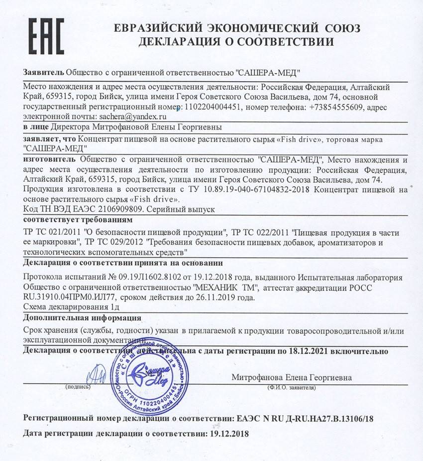 Эффективность активатора клева Fish Drive одобрена Евразийским экономическим Союзом. Прежде чем отправить прикормку для рыб в продажу, изготовитель протестировал продукт на эффективность и безопасность.