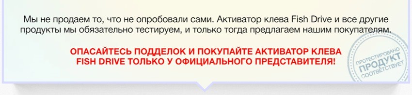 Производитель называет несколько причин, по которым активатор рыбного клева марки Фиш – драйв не поставляется в офлайн магазины: