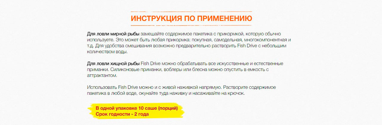 В инструкции к прикормке для рыб дана информация по использованию продукта для ловли хищных и мирных пород. Каждая упаковка Фиш Драйва содержит 10 порций, упакованных в саше.
