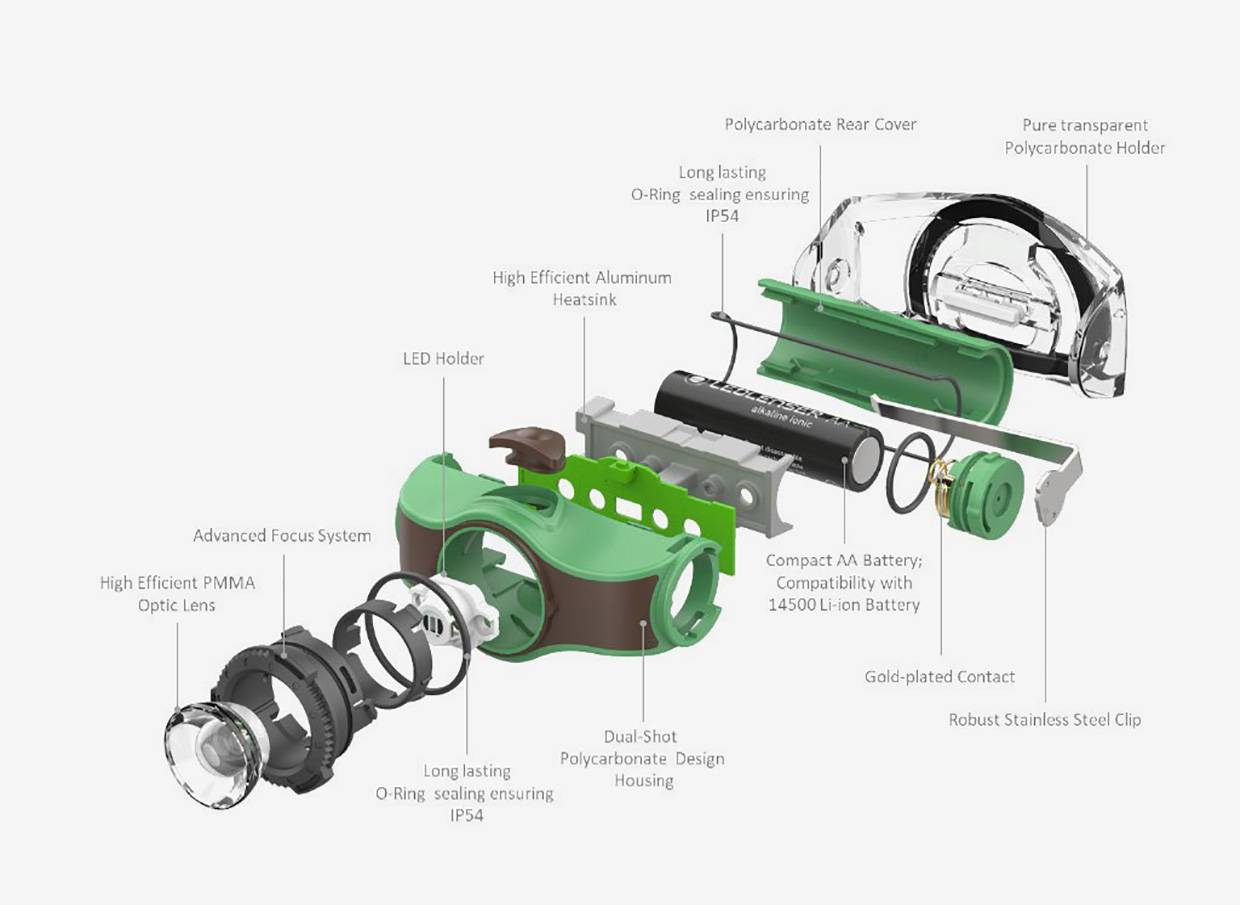 Компактный фонарь, весом меньше 50 г. Яркость устройства регулируется, а время работы составляет от 27 часов до 50 минут. В качестве источника питания используются батарея или аккумулятор формата ААА.