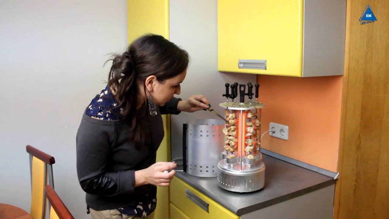 Электрошашлычница представляет собой электрический мангал вертикального типа. Туда вмещается несколько шампуров, которые как вертел вращаются вокруг своей оси, равномерно прожариваясь от лампы. Эта самая лампа жарит мясо всего за 15-20 минут при температуре 600 градусов.