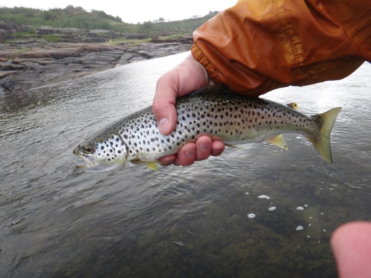 Корпус взрослого экземпляра усеян небольшими темными пятнышками, заходящими за плавники. И у радужки они всегда именно темные, а не цветные, как у ручьевой форели.