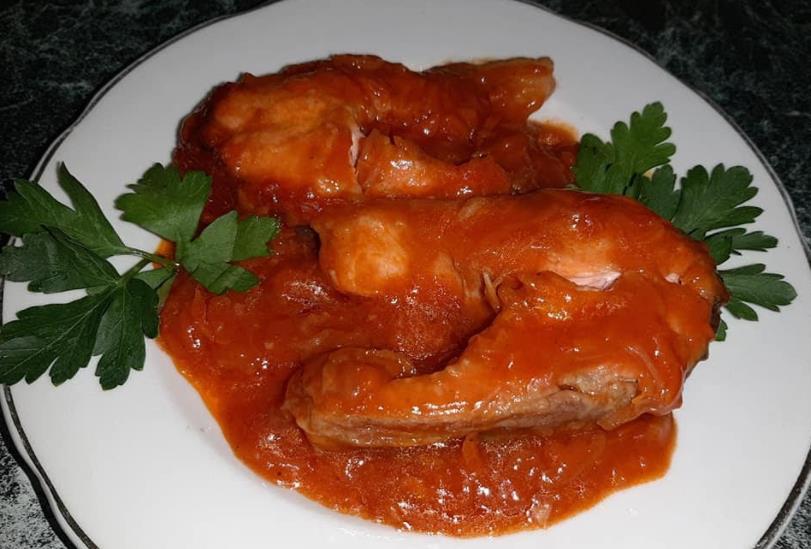 - Когда время закончится, залить форель томатным соусом. Снова отправить в духовой шкаф на 20 минут.