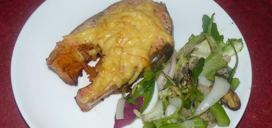 По сути предыдущий рецепт показывает, как вкусно запечь стейки, чтобы они остались при этом сочными и мягкими внутри. В этом нам отлично помогает фольга. Именно она позволяет не пересушить достаточно тонкие куски, оставив всю сочность внутри. Таким образом под ее слоем рыбу надо запекать 20 минут.