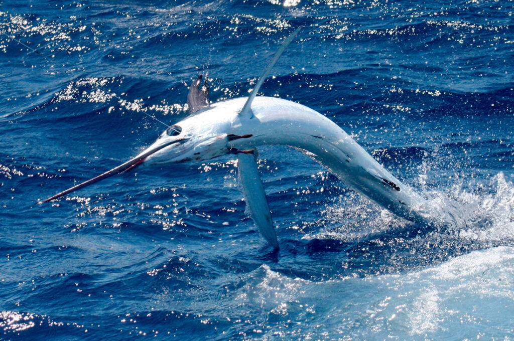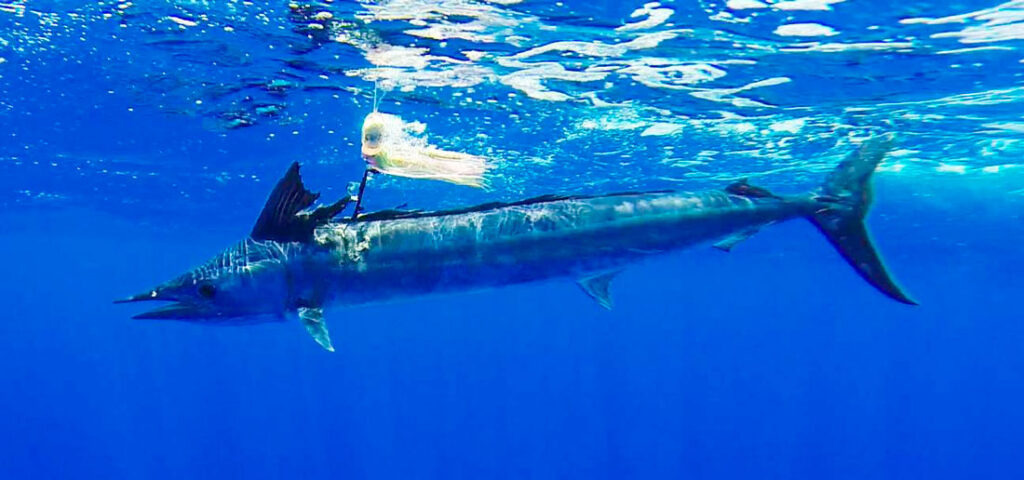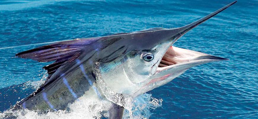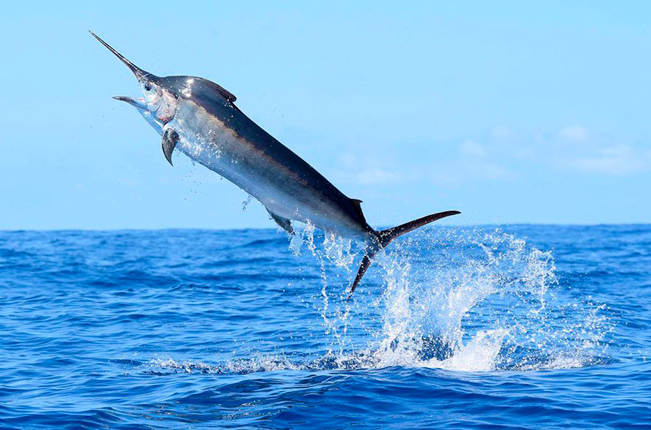 - Отличительная особенность — темная, практически черная спина. Полос и пятен у взрослых черных марлинов не имеется.