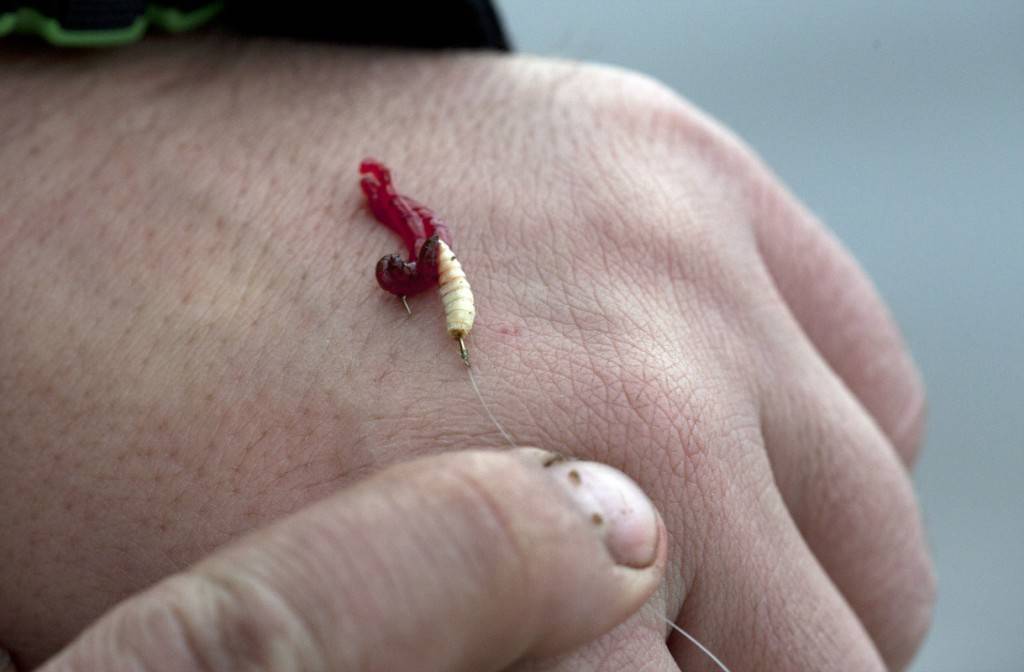 - На этот незанятый кончик крючка можно смело насаживать от двух до трех личинок в зависимости от их размера. Они вместе образуют некий живой пучок, который будет отлично подходить в том случае, когда рыба голодная и хорошо клюет.