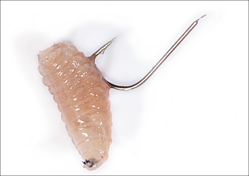 Важно при этом его только сдерживать, но не сдавливать, иначе он просто лопнет и потеряет свою форму. С более толстого конца личинки (ее головы) продеть под кожей крючок, не задевая при этом внутренностей опарыша. Чтобы этого сделать удачно, следует немного оттянуть его кожу цевьем крючка, и только потом проколоть опарыша одним быстрым движением