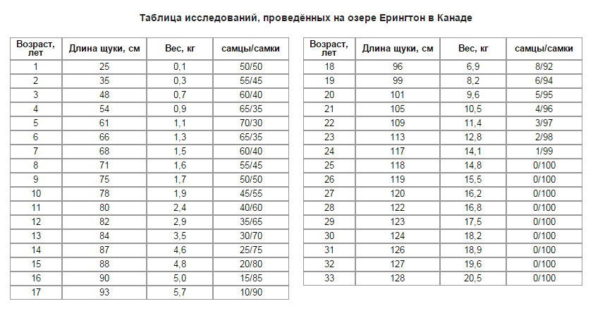 О возрасте щуки ходят легенды, и байки, а вот серьёзные исследования в рыболовной литературе встречаются гораздо реже. Результаты одного из исследований на озере Ерингтон в Канаде, меня удивили. Я полагал, что возраст пойманных мною щук гораздо меньше. Другое исследование привёл в своей статье «Щуки крайнего севера» Александр Стафиевский. Ихтиологи, исследовавшие чешую его щуки 17.5 кг, сказали, что ей было 34 года, это даже больше чем у канадцев. Другое достаточно обширное исследование приводится в книге Synopsis of biological data on the northern pike, Esox lucius Linnaeus, 1758, голландца Александра Раата, изданное в 1988 году, в нем содержаться очень доступные для понимания графики зависимости длины щук со всего света от возраста.