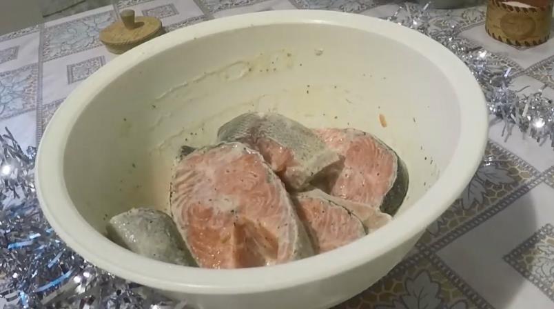 Положить в емкость с рыбой сметану и тщательно перемешать. Отставить для маринования на 25 минут.