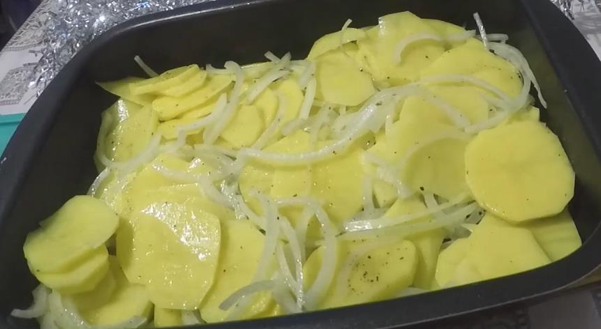 Картошку вымыть, очистить и нашинковать тонкими кольцами. Лук нарезать полукольцами. Выложить на противень, смазанный растительным маслом, слой посоленного и поперченного картофеля, а на него – луковые ломтики.