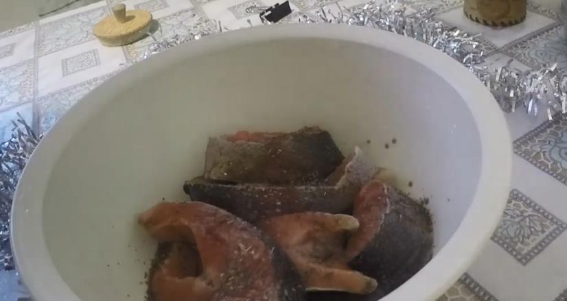 - Через сутки достаём продукт, снимаем остатки соли салфеткой.