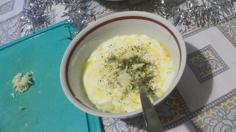 Поставить противень, накрытый фольгой, на 15 минут в духовку, разогретую до 200 градусов. В отдельной миске перемешать яйцо со сметаной и протертым чесноком, солью и перцем.