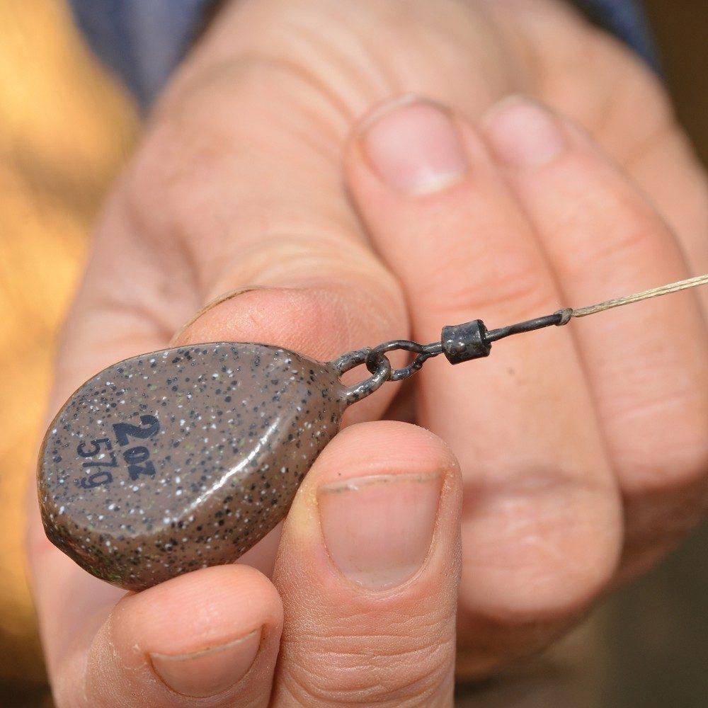 - Капроновая нить пропускается через отверстие грузила. Оно будет легко перемещаться по леске, не опускаясь ниже поводки благодаря карабину.