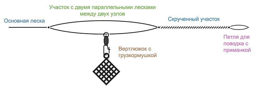 Представьте предыдущий монтаж, в котором как будто кормушка и поводок поменялись местами. Это и будет вертолет с двумя узлами, названный так за свободное вращение отвода с крюком вокруг основной лески. Кормушка при этом имеет концевое крепление как в оснастке для донки, рассмотренной в начале обзора.