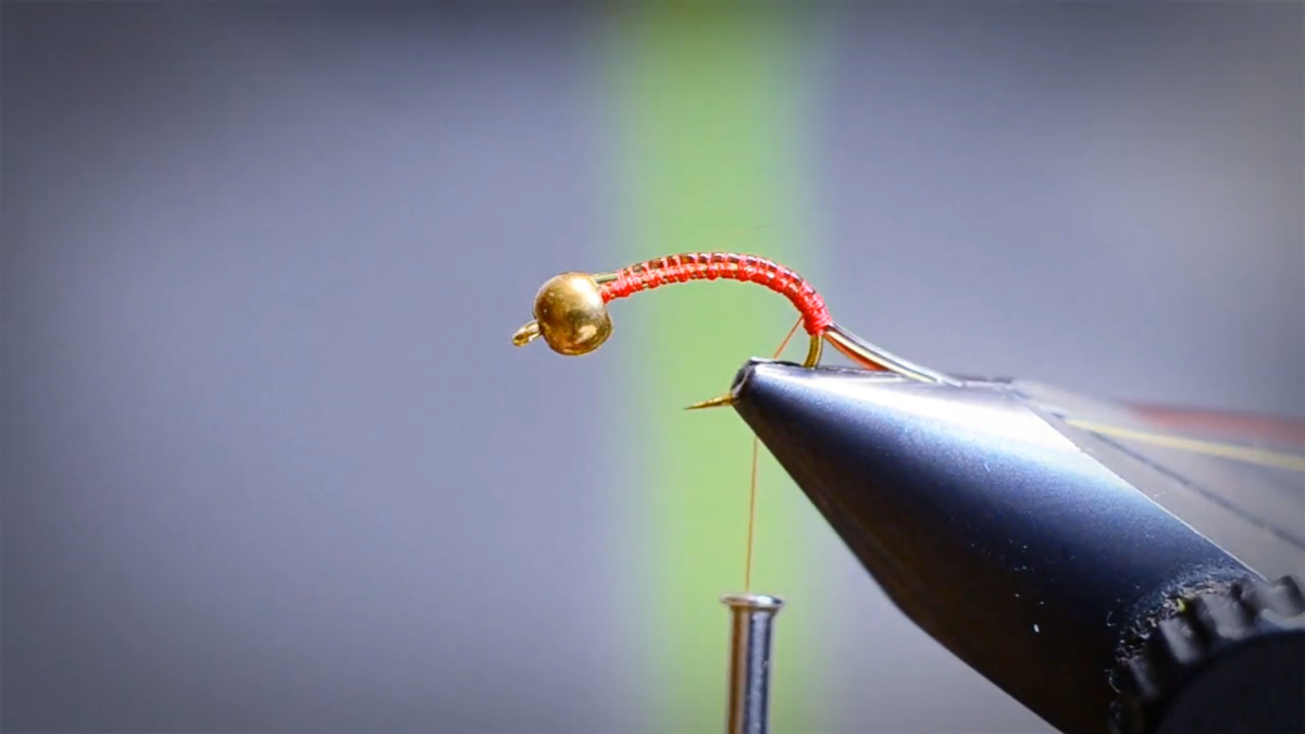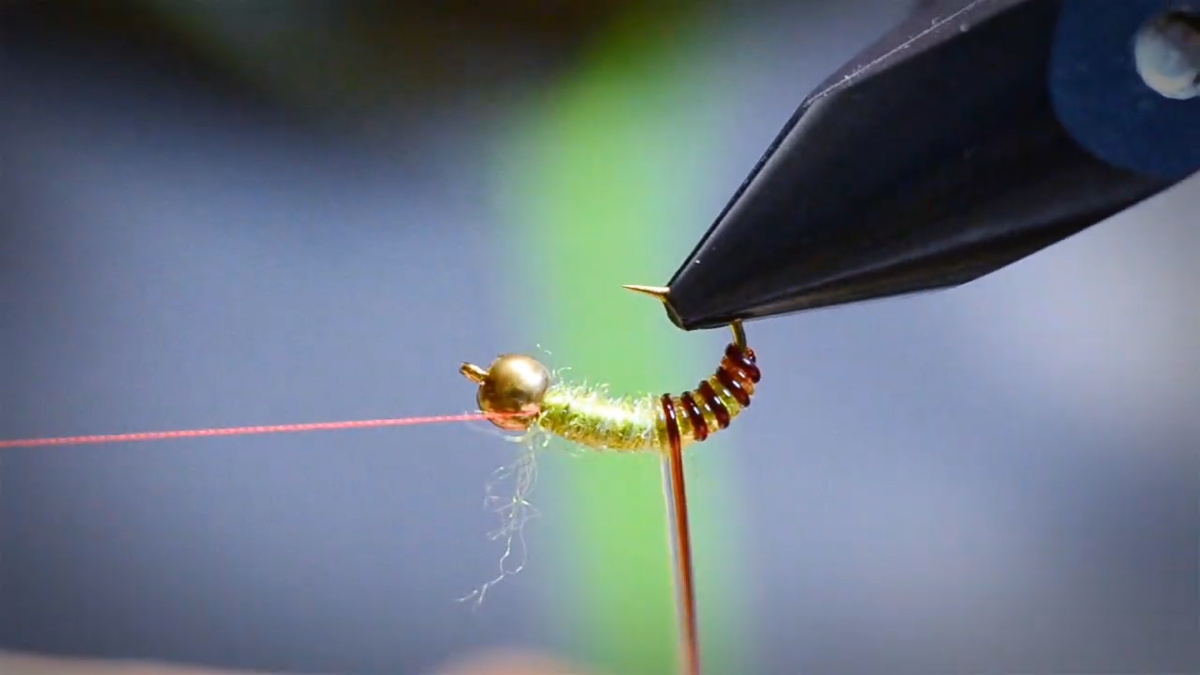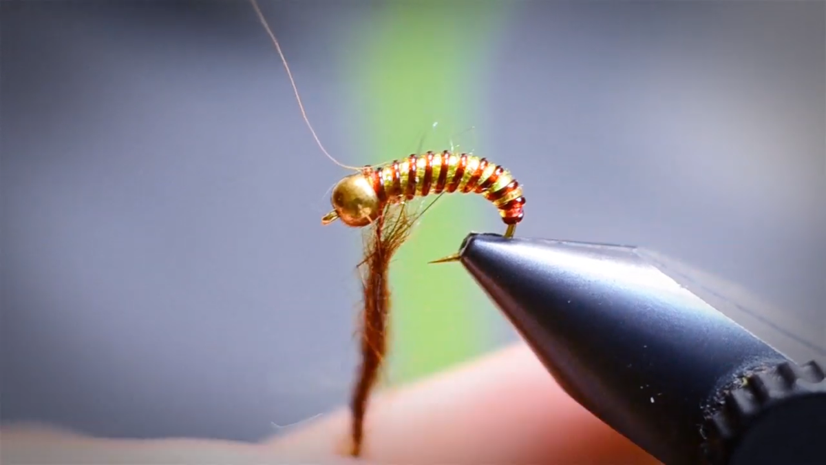 Теперь можно крепить крючок, надевать головку и делать свинцовую подгрузку. Последнюю нужно зафиксировать при помощи монтажки. Из неё же нужно сделать подложку. После этого медную проволоку крепим на крючок. От плёнки нужно отрезать небольшую полоску. Размер – примерно такой же, как толщина тела мушки. Нужно заузить конец, чтобы его фиксация на крючке упростилась.