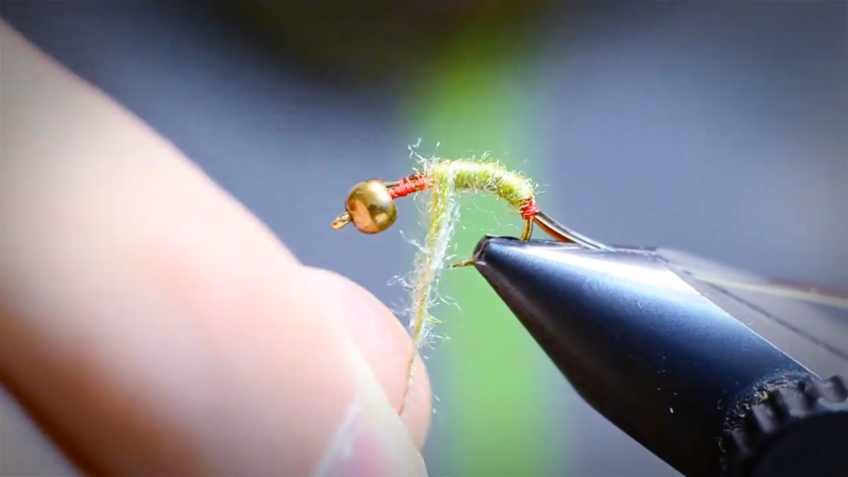 - После наматывания брюшной области оставляем свободную часть шерсти для копирования хвостовых придатков.