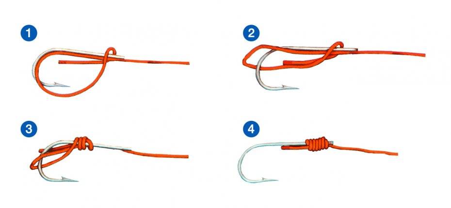- крючок проворачивается несколько раз внутри петли, и леска с концов стягивается в узел.