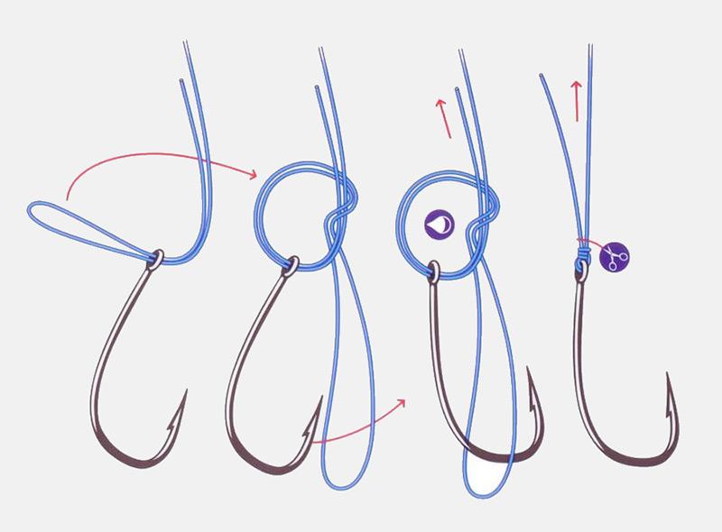 - крючок проворачивается несколько раз внутри петли, и леска с концов стягивается в узел.