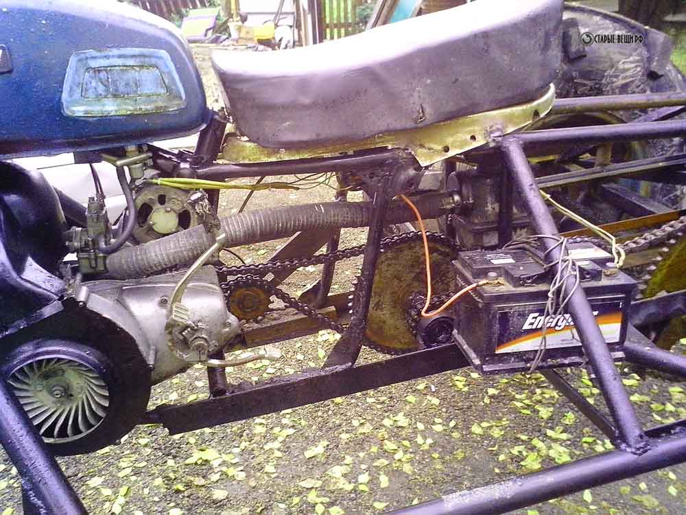 Как видите мы и двигатель уже начали устанавливать. Двигатель как я уже и писал от инвалидки. Он хорош тем, что у него принудительное охлаждение и электростартер.