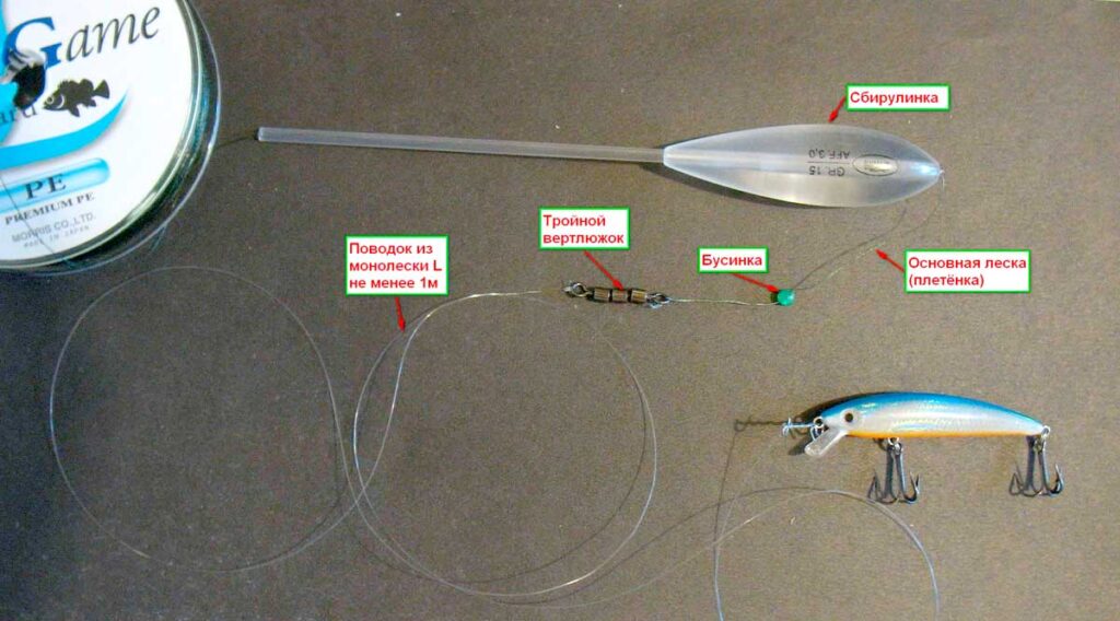 Во время ловли на сбирулино подходит и монофильная леска, и леска-плетенка для спиннинга. Первая выигрывает в малозаметности и способности гасить рывки рыбы при вываживании. Преимущество второй в большей чувствительности и прочности. Выбор между ними зависит большей частью от личных предпочтений рыболова, учитывая, что приманка отдалена от основной лески достаточно длинным поводком.