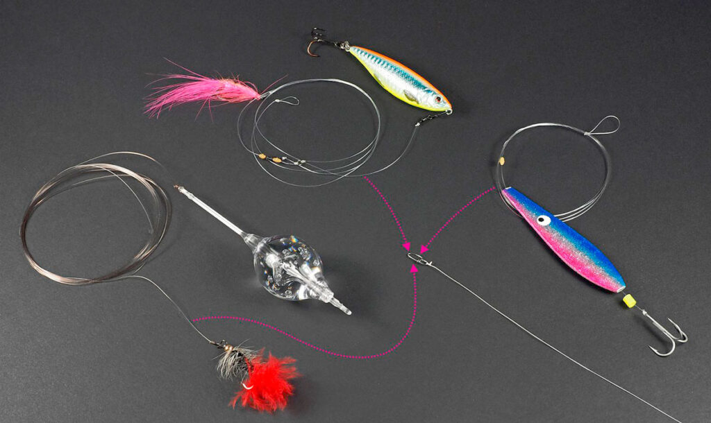 Подобных оснасток немало, в основу которых входят тяжелые поплавки сбирулино. Как правило, в них монтируется по несколько крючков, расположенных до поплавка или после него. Но это, в основном, модифицированные варианты, полученные на основе классической оснастки, имеющей по одному крючку.