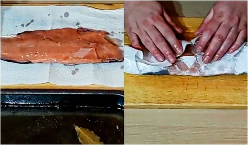 5. Спустя это время рыбные половинки кладем на бумажное полотенце и тщательно ее промокаем.