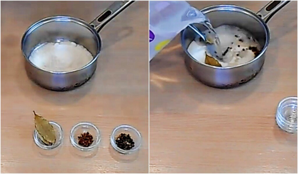 1. Сначала необходимо сварить рассол, которым мы будем заливать рыбу. В кастрюлю посыпаем соль и сахар. Кидаем в емкость горошки черного и душистого перца, а также гвоздику и лавровый лист. Заливаем эти ингредиенты одним литром воды и отправляем на огонь для закипания.