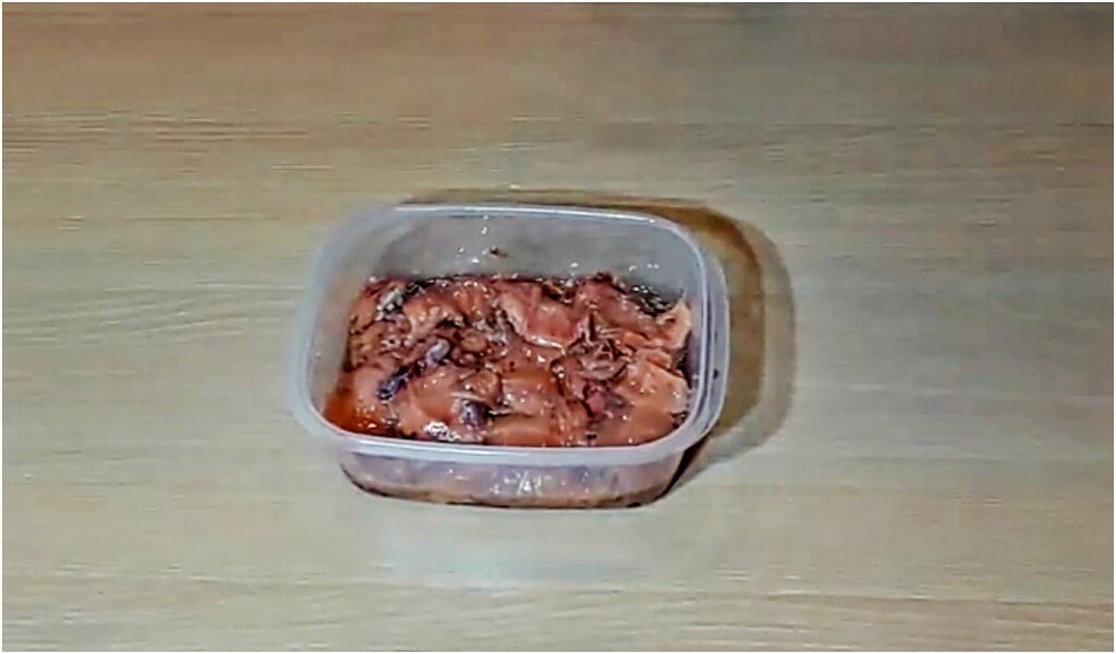 Складываем все кусочки в контейнер или миску, накрываем крышкой и отправляем на сутки в холодильник.