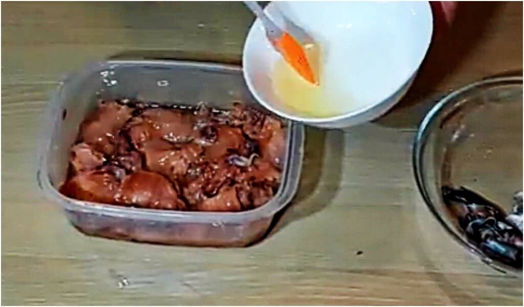 - Промыть водой и отделить от неё кончик хвоста. Затем положить сверху на миску и поставить минут на 40 в холодильник, чтобы стекла лишняя вода и сукровица.