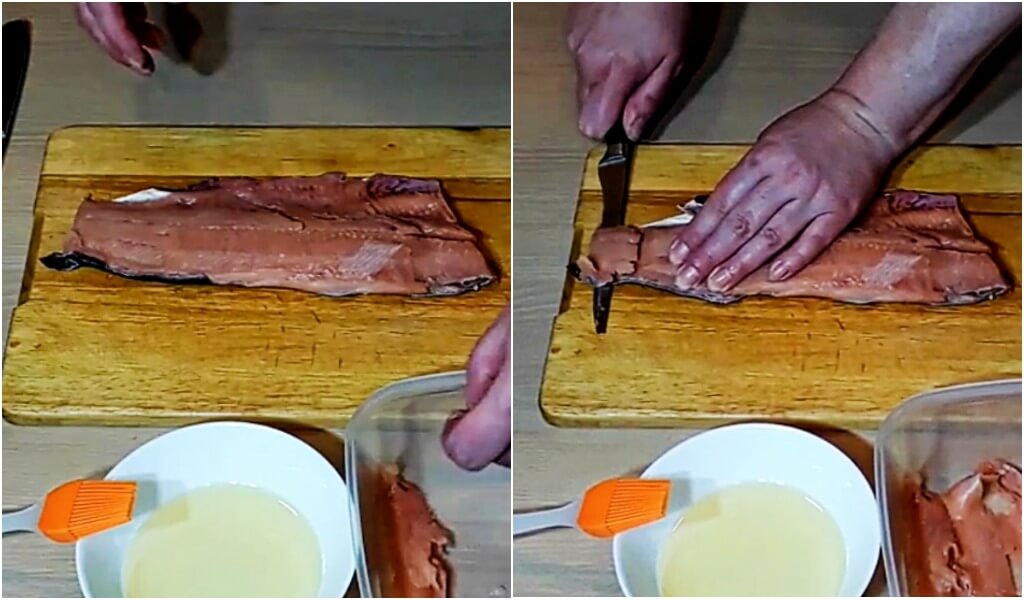 - Маринадом покрыть филе со стороны мяса и сложить кожицей кверху. Поставить в холодильник на 24 часа.