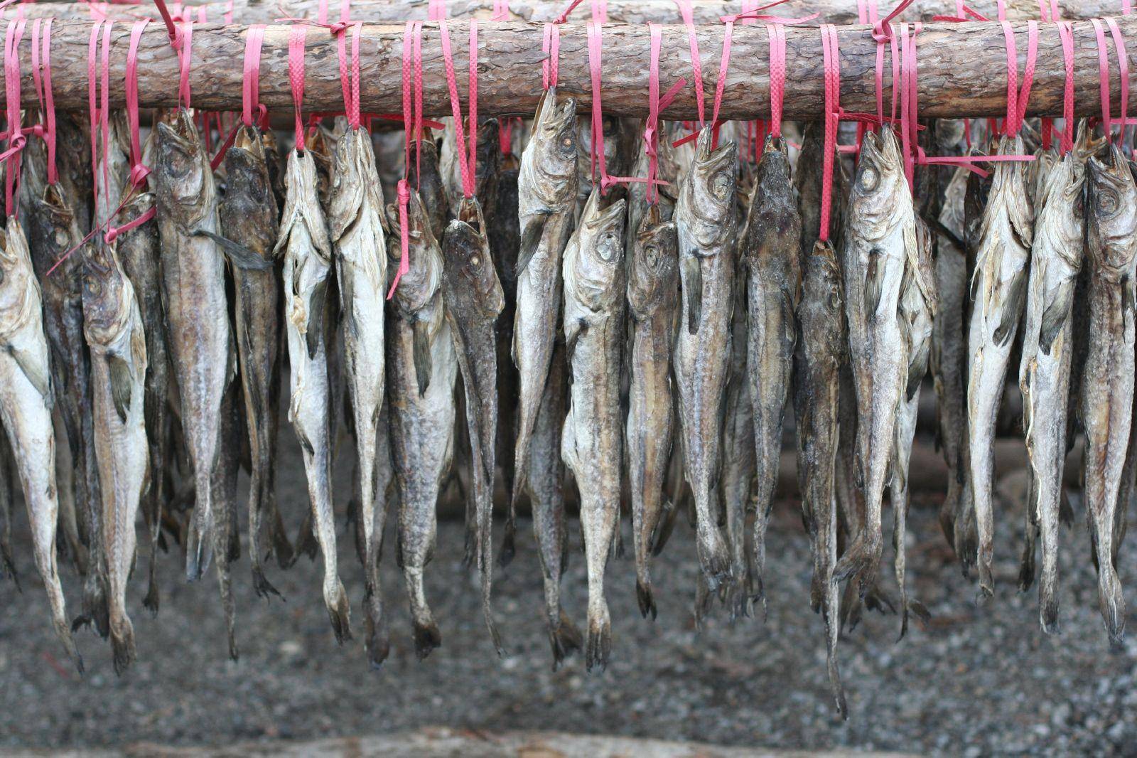 Развешивают рыбные «гирлянды» с промежутком между тушками, чтобы они не соприкасались друг с другом. При хорошей теплой, ветреной погоде продукт становится готовым к употреблению за 5-10 суток в зависимости от размера тушек. Если воздух с повышенной влажностью, то в брюшки рыбин среднего и большого размера вставляют распорки.