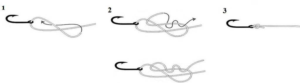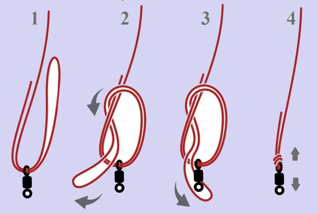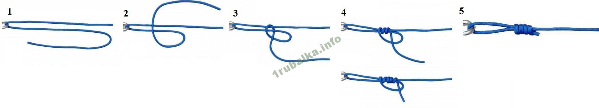 Знают фактически все рыбаки. Его предназначение – это крепление вертлюжков к основной леске, а также соединение твистеров с крючками, у которых имеются ушки. К сожалению, его вязание требует, чтобы леска была сложена вдвое, а это увеличивает габаритные размеры узла.
