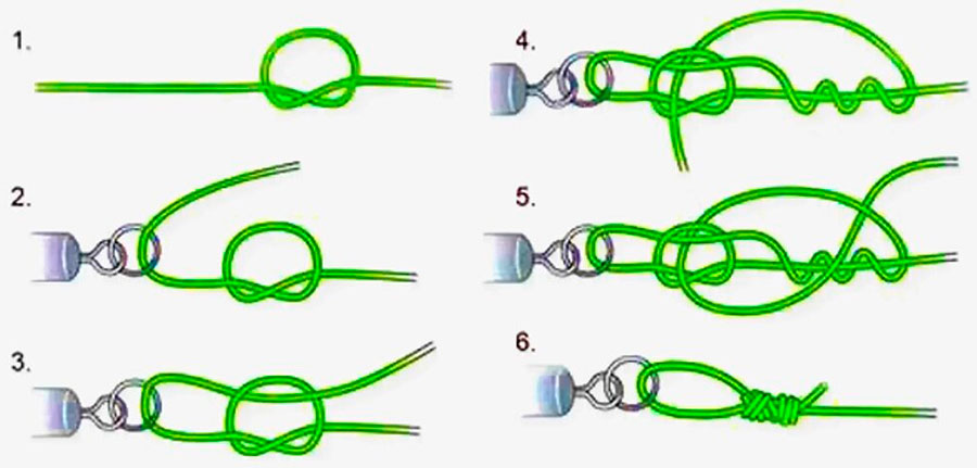 Знают фактически все рыбаки. Его предназначение – это крепление вертлюжков к основной леске, а также соединение твистеров с крючками, у которых имеются ушки. К сожалению, его вязание требует, чтобы леска была сложена вдвое, а это увеличивает габаритные размеры узла.