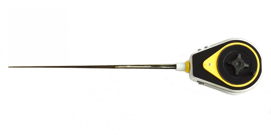 Крепление в одной точке с помощью кембрика. Сигнализатор крепится с помощью короткого стержня, который вставляется в кембрик, заранее расположенный на леске.