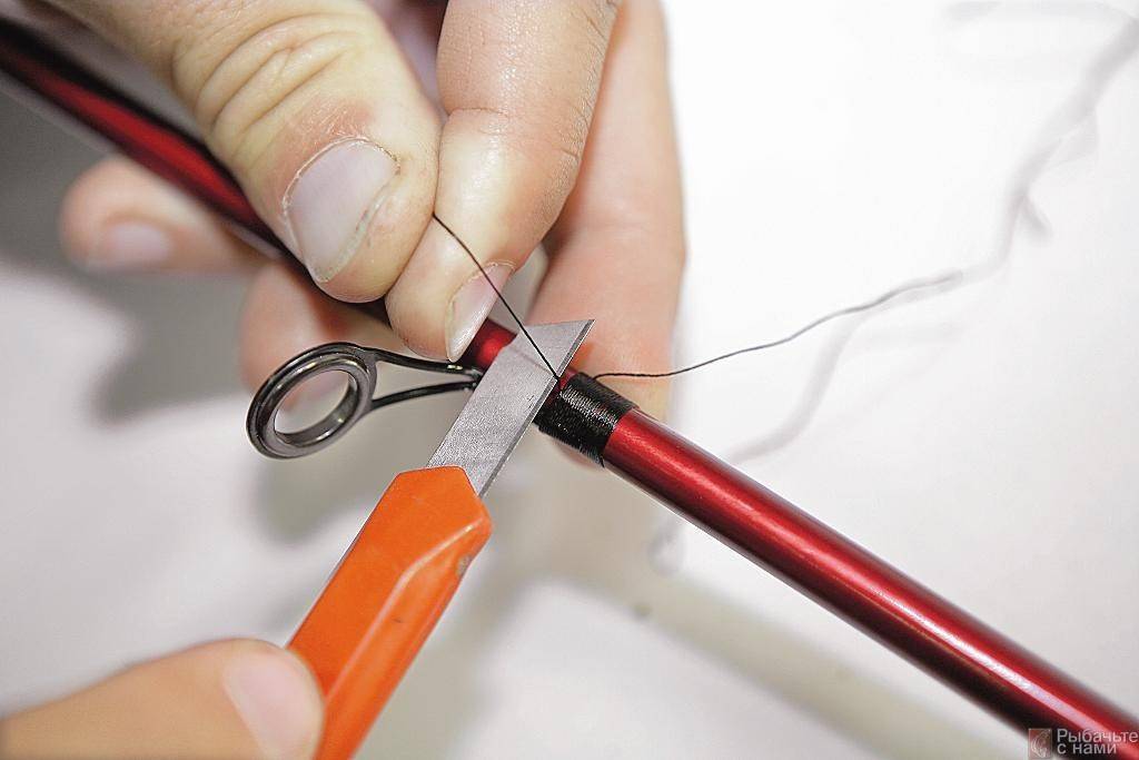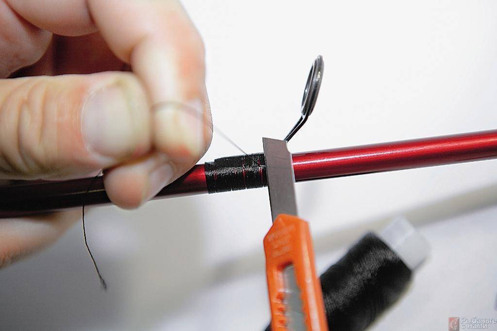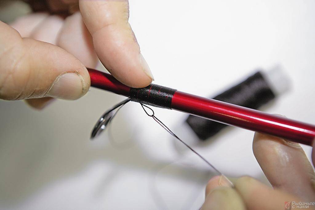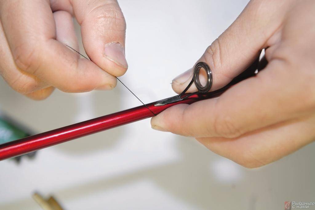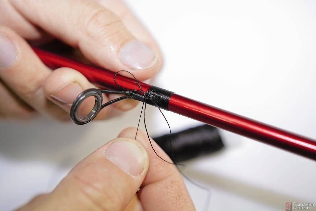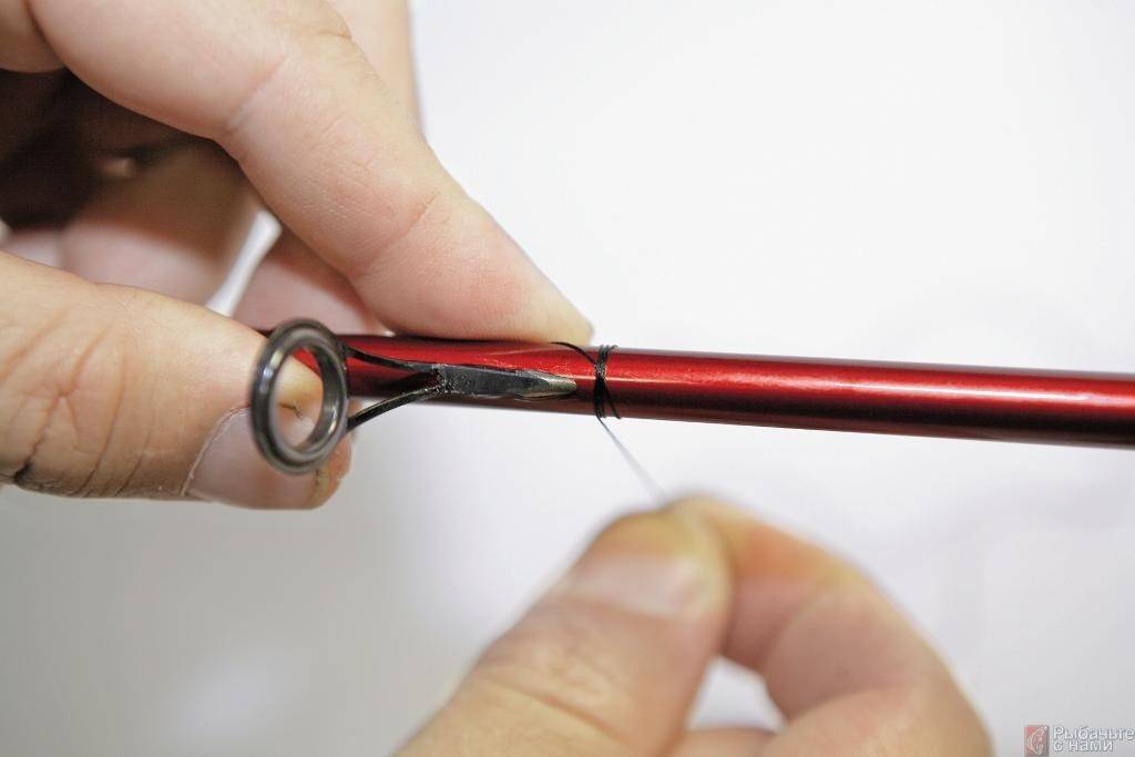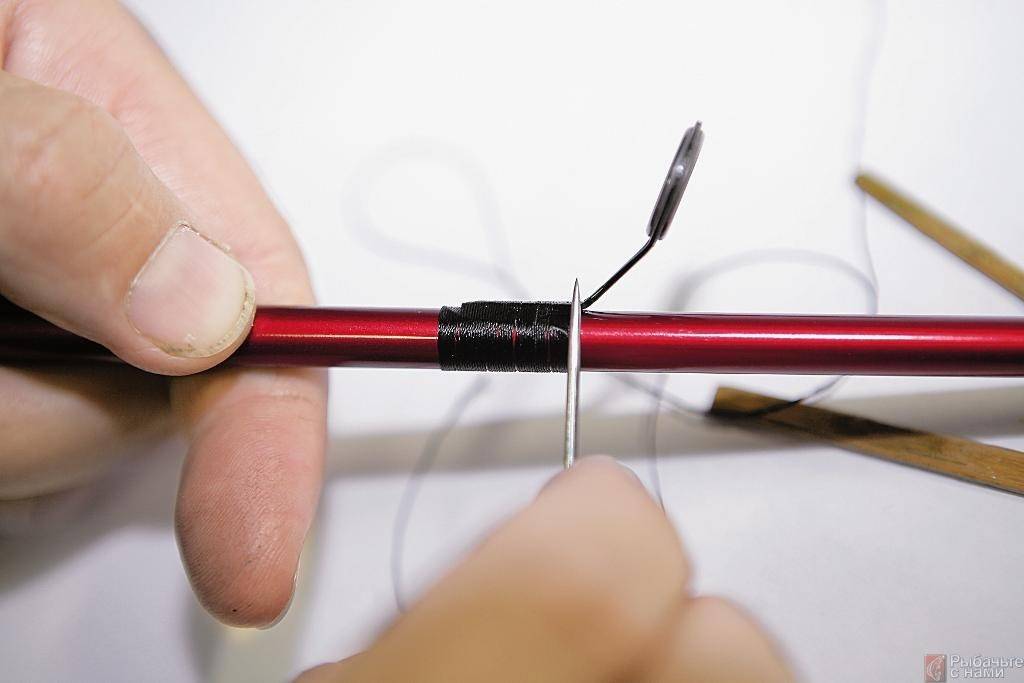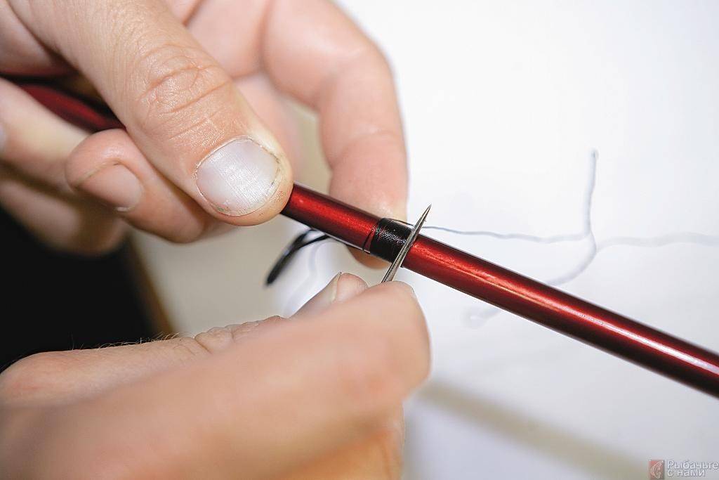 Особенно аккуратно следует приматывать кольца к вершинке удилища, тонкие стенки которой продавить очень легко. Готовую обмотку нужно подровнять толстой швейной иглой, а затем покрыть лаком.
