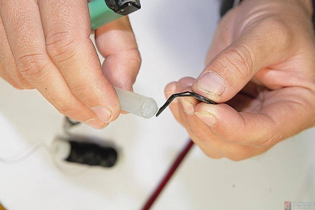 Порой от этого металлическая лапка вдавливается в бланк удилища. Именно в таком месте позже происходит поломка. Нормальное натяжение нити при обмотке около 100 г. А большое количество витков и последующая заливка лаком дают очень прочное соединение.