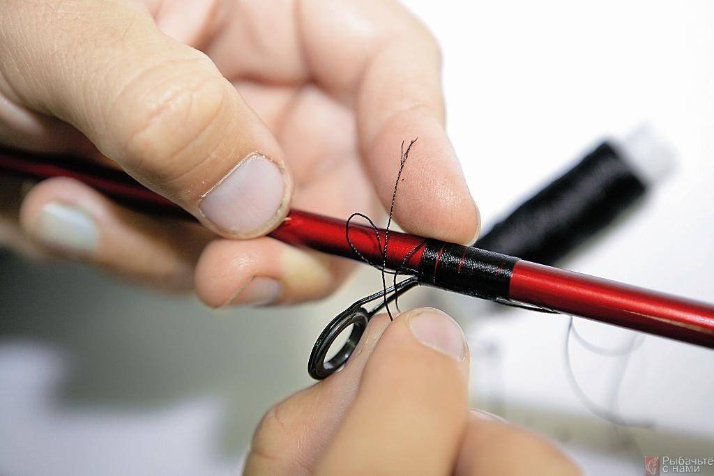 Далее наденьте тюльпан на конец спиннинга. Тюльпан должен «сесть» туго, если заметили люфт — сделайте подматывание нитью. После того как клей высох, в месте крепление обмотайте плотно синтетическую нить, после чего вскройте ее лаком.