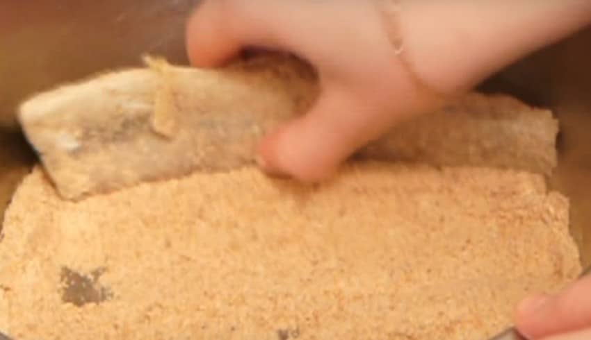4. Возьмите одну тушку путассу и обваляйте ее в сухарях.