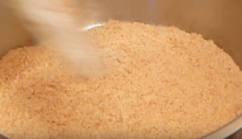 - Вместо муки можно использовать сухари, которые требуется перемолоть в крошку. Их тоже нередко соединяют с приправами, но чаще сюда добавляют такие же измельченные орехи. Правда, они не обеспечивают такой «гладкости», как мука, поэтому не на всех сковородах позволяют защитить продукт от пригорания.