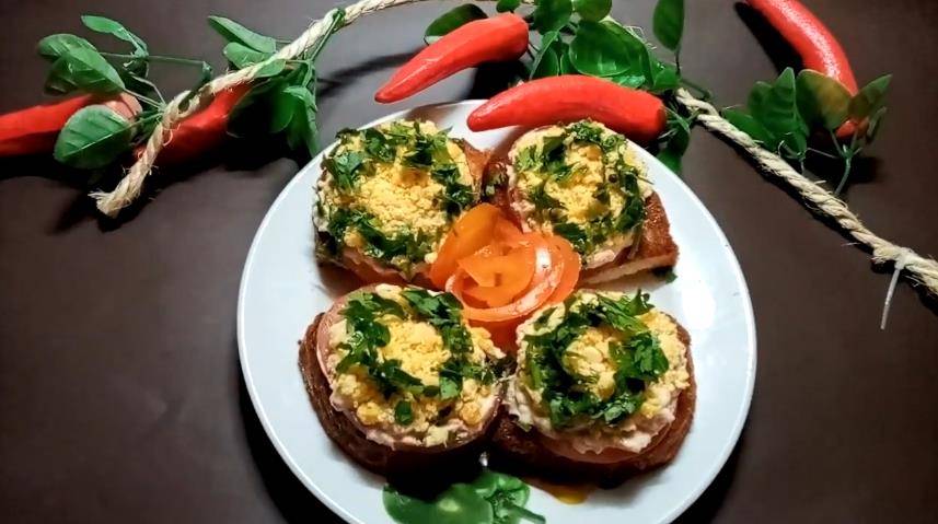 Смотрите, есть несколько способов приготовления. Первый, вы можете размягчить масло, вынув его заранее из холодильника. Отварные яйца натереть, и смешать с маслом, смазав кусочки хлеба, а сверху рыбку.