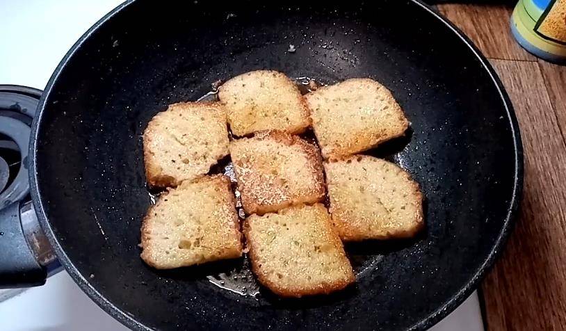 Хлеб нарезаем тонкими квадратиками и подсушиваем в духовке. Если есть корочки, то их нужно срезать.