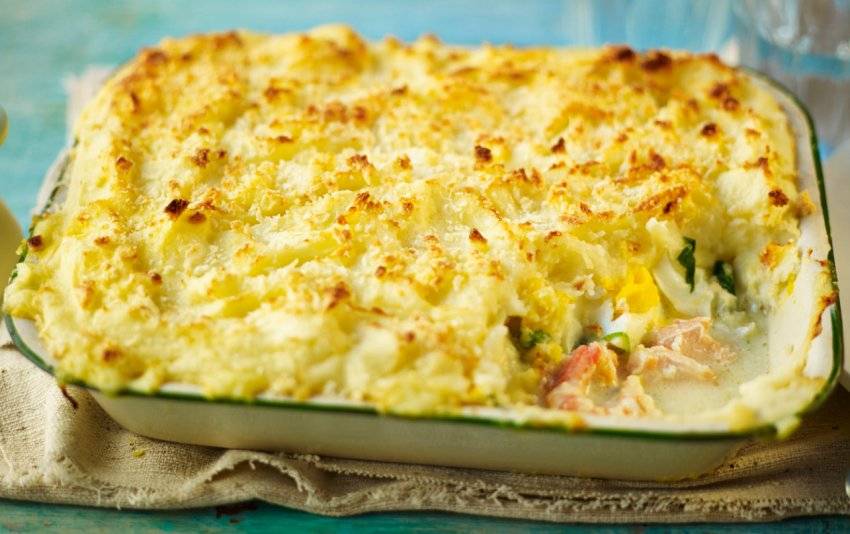 - Слоями выложить пюре из картошки, рыбу с овощами. Залить оставшимся молоком.