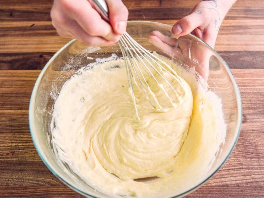 - Постепенно добавить охлажденную воду, чтобы образовалось жидкое тесто до густоты, примерно, как магазинная сметана